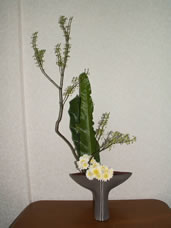 青もじの枝の間に、大タニワタリを立たせ、花器口に、